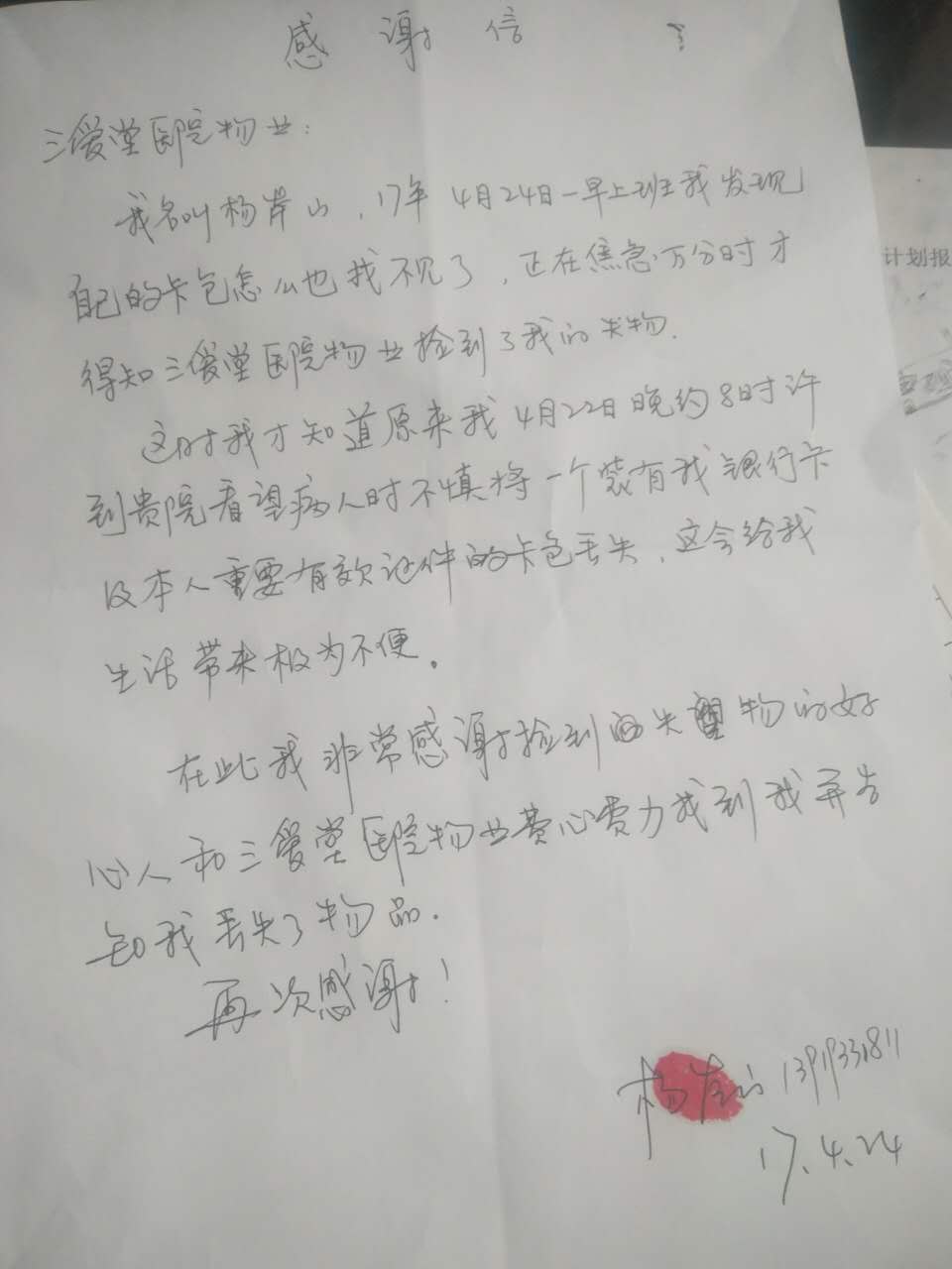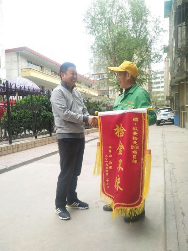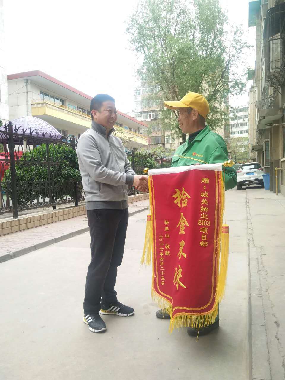 424一早,失主就來到了三愛堂醫(yī)院并將一副題為“拾金不昧”的錦旗送到了物業(yè)辦公室。失主激動地握住賈經(jīng)理的手說道:“感謝城關物業(yè)培養(yǎng)出了這樣一個品德高尚的員工,要不是這位員工,會給我的生活帶來多大的不便呀!”