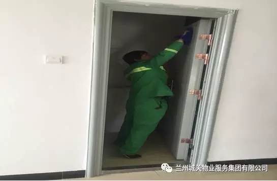 正在擦拭宿舍樓內(nèi)的樓梯間門(mén)上的灰塵