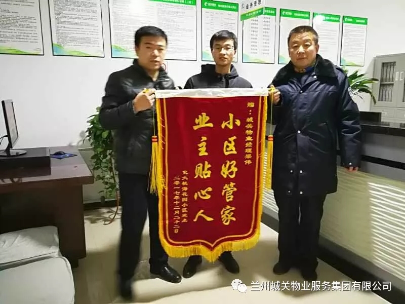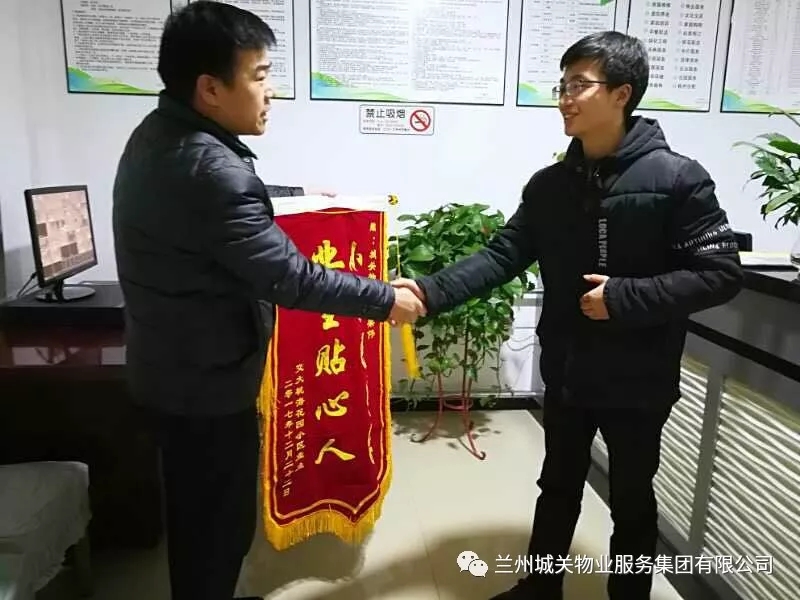1月14日晚,交大桃;▓@業(yè)委會(huì)劉主任代表全體業(yè)主,將一面題有“小區(qū)好管家,業(yè)主貼心人”的錦旗送至項(xiàng)目經(jīng)理梁偉手中,并對(duì)城關(guān)物業(yè)的服務(wù)工作給予了高度的評(píng)價(jià)和肯定。
