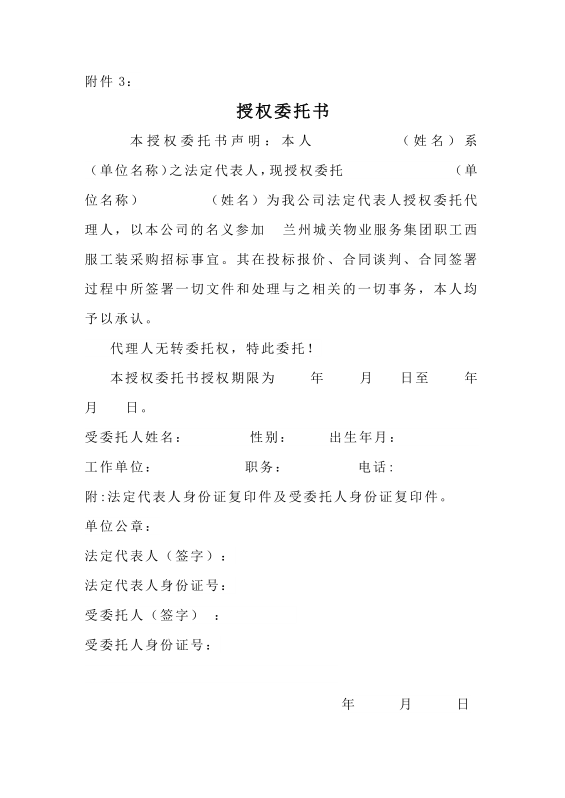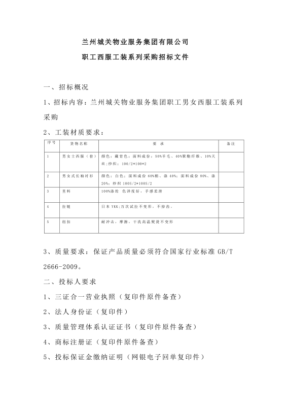 蘭州城關(guān)物業(yè)服務集團有限公司 職工西服工裝系列采購招標文件