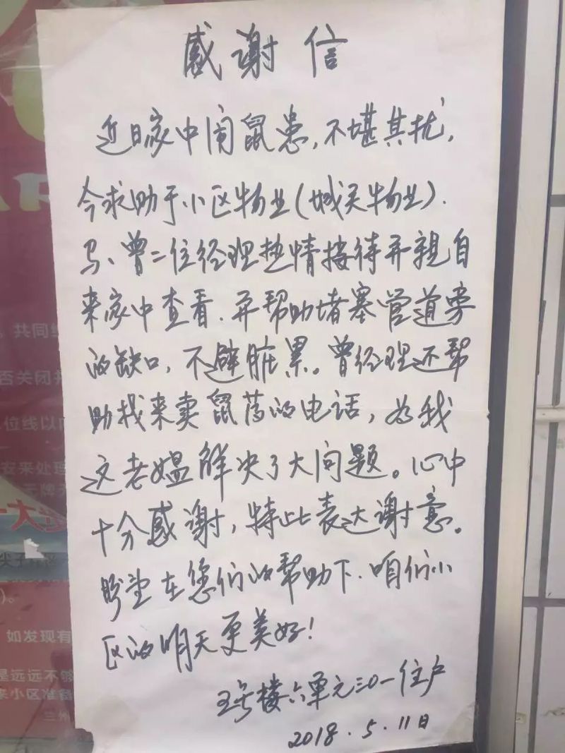 近日,市政府雁寧路小區(qū)院內(nèi)張貼的一封感謝信,引起了大家的注意。原來(lái)這封感謝信是該小區(qū)業(yè)主所寫,簡(jiǎn)單樸實(shí)的語(yǔ)言中充滿了對(duì)城關(guān)物業(yè)工作人員的肯定與感激,字里行間體現(xiàn)出了對(duì)我們工作的支持和認(rèn)可!