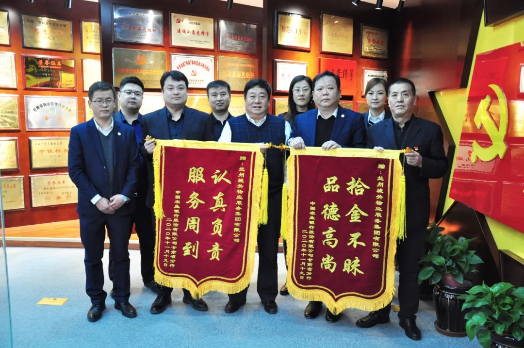 中國(guó)農(nóng)業(yè)銀行甘肅省分行總務(wù)處總經(jīng)理孫雪峰把兩面錦旗送到蘭州城關(guān)物業(yè)服務(wù)集團(tuán)有限公司董事長(zhǎng)楊民召手中,表達(dá)了對(duì)我們優(yōu)質(zhì)服務(wù)的肯定和感謝。