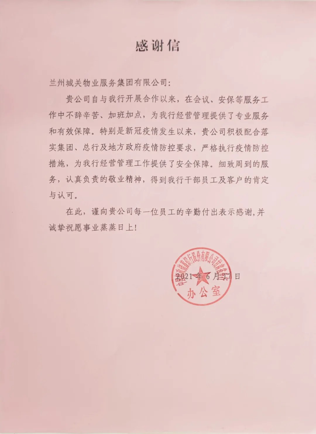 中國(guó)郵政儲(chǔ)蓄銀行甘肅省分行是城關(guān)物業(yè)服務(wù)的眾多項(xiàng)目之一,自合作以來(lái),我們?cè)跁?huì)議、安保等服務(wù)工作中為甲方提供了專業(yè)服務(wù)和有效保障;尤其在疫情期間,我們嚴(yán)格執(zhí)行疫情防控措施,為銀行的正常運(yùn)轉(zhuǎn)提供了安全保障。我們認(rèn)真負(fù)責(zé)的工作態(tài)度和不辭辛苦、加班加點(diǎn)的敬業(yè)精神得到了銀行員工及服務(wù)客戶的肯定與認(rèn)可。