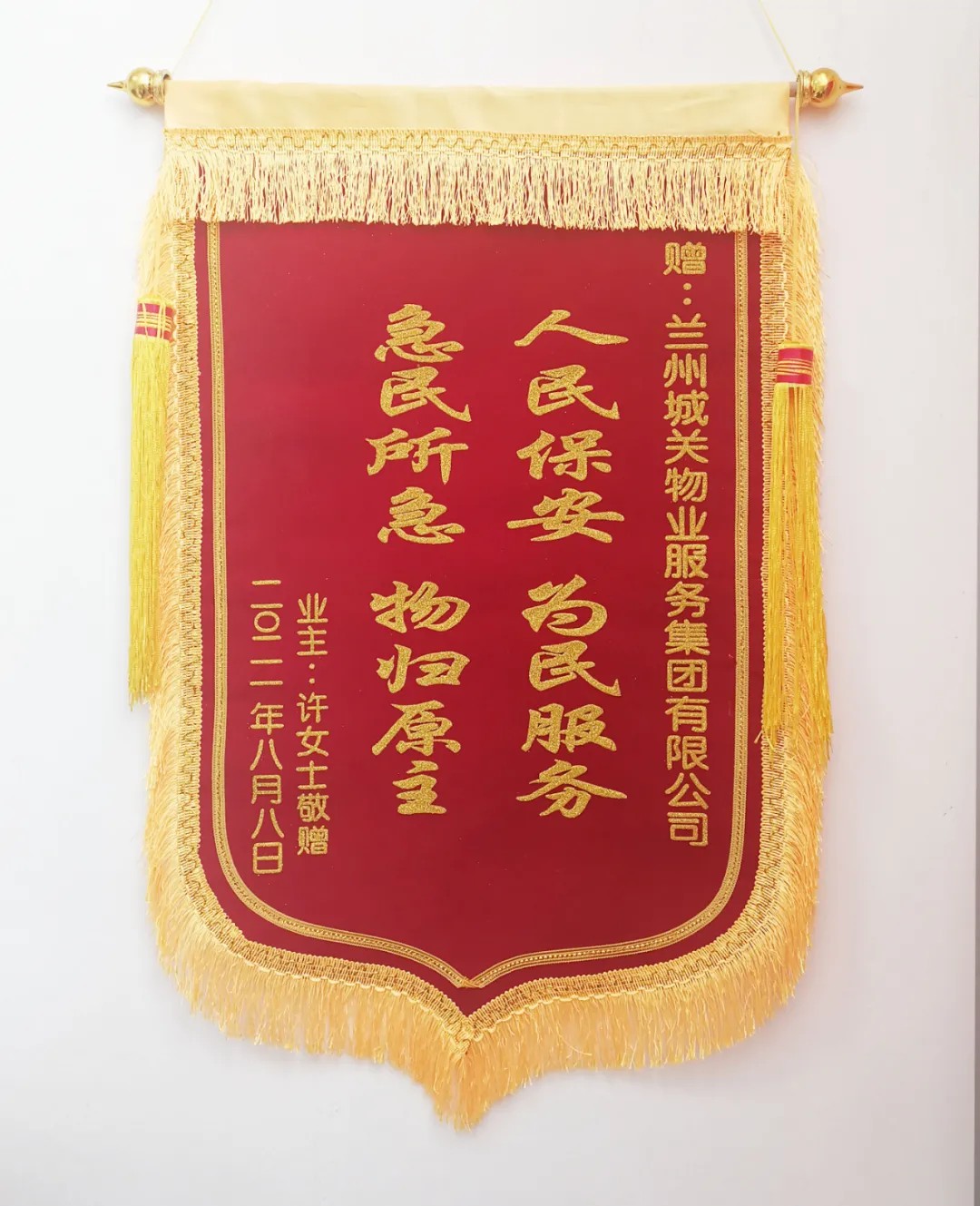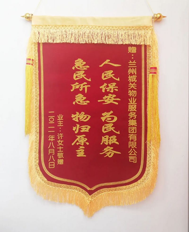 重邦康城小區(qū)業(yè)主將一面寫(xiě)有“人民保安,為民服務(wù),急民所急,物歸原主”的錦旗送到我們手中。業(yè)主在進(jìn)入小區(qū)后不慎將貴重的車鑰匙遺失在小區(qū)內(nèi),物業(yè)工作人員立即幫助業(yè)主進(jìn)行尋找,最終在很快的時(shí)間內(nèi)找到鑰匙,物歸原主。業(yè)主表示感謝,送來(lái)錦旗。