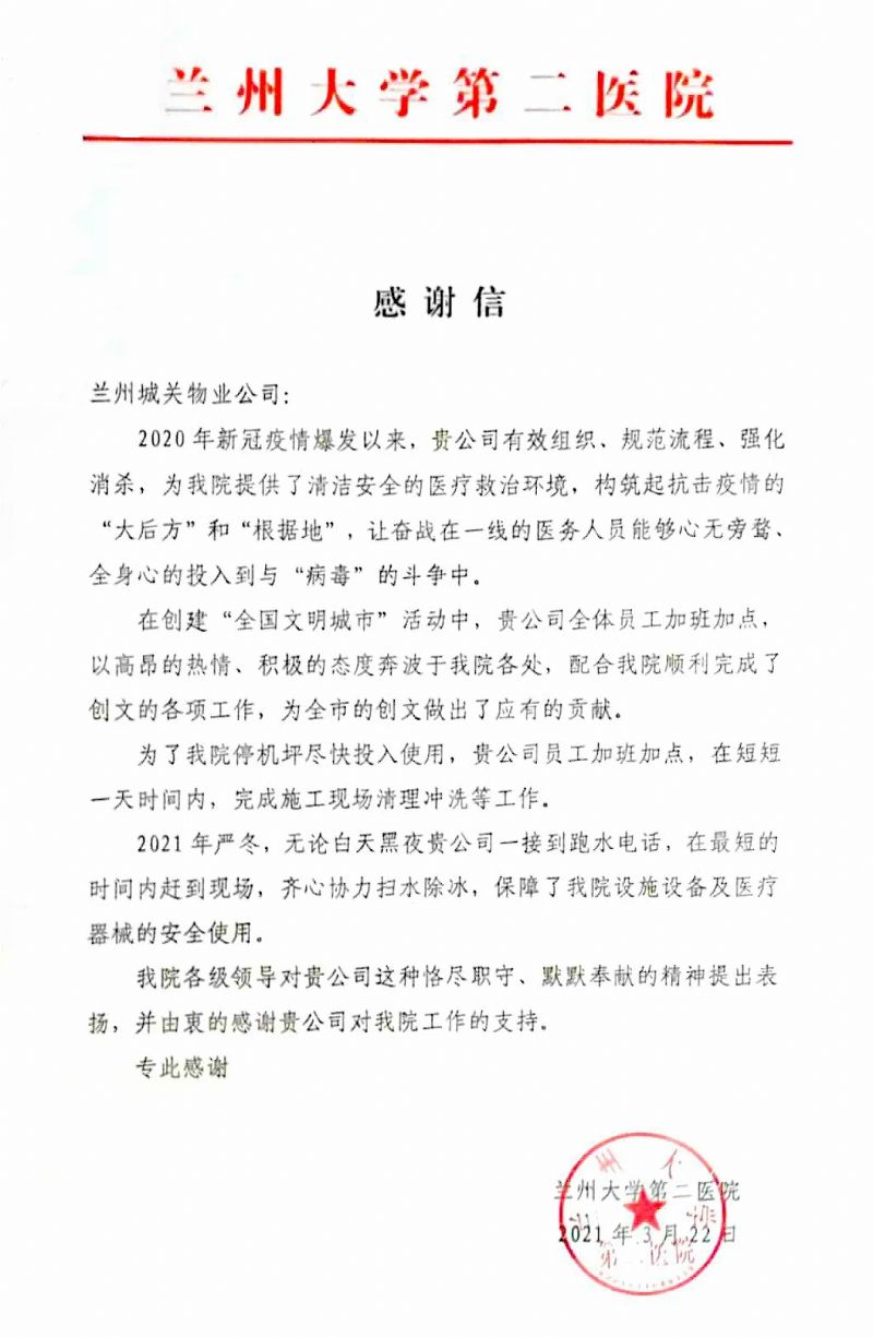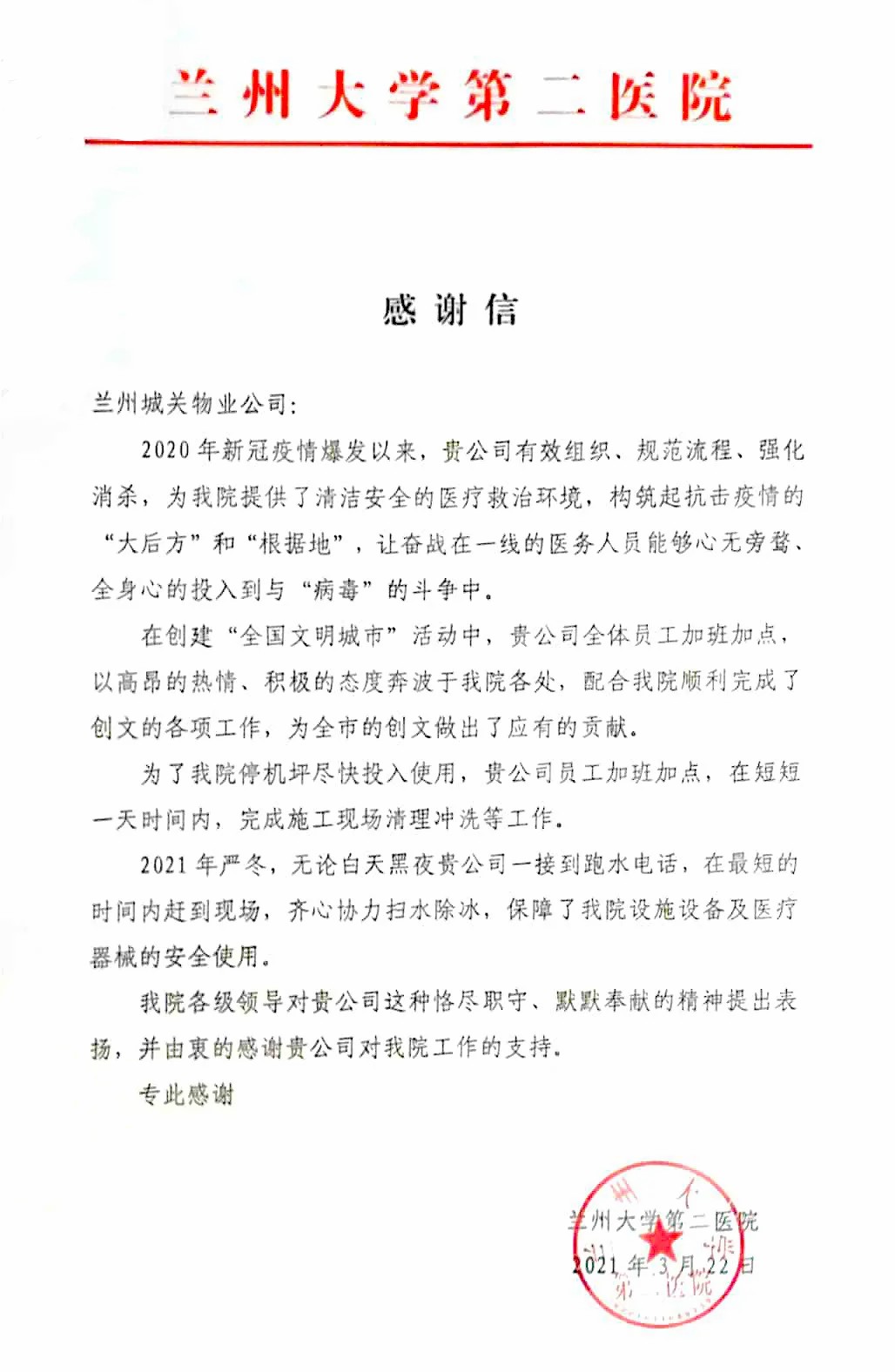 蘭州大學(xué)第二醫(yī)院后勤保障處劉處長(zhǎng)一行人專程來到蘭州城關(guān)物業(yè)服務(wù)集團(tuán)有限公司,將一面寫有“物業(yè)好管家 業(yè)主貼心人”的錦旗贈(zèng)予蘭州城關(guān)物業(yè)服務(wù)集團(tuán)有限公司總裁楊佳林手中,以此表達(dá)對(duì)于城關(guān)物業(yè)的感謝和認(rèn)可。劉處長(zhǎng)表示,2020年新冠疫情爆發(fā)以來,城關(guān)物業(yè)有效組織,規(guī)范流程,為醫(yī)院提供了清潔、安全的醫(yī)療救治環(huán)境,與醫(yī)院一起構(gòu)筑起抗擊疫情的“根據(jù)地”。城關(guān)物業(yè)加班加點(diǎn)保障醫(yī)院后勤的同時(shí),積極配合醫(yī)院順利完成各項(xiàng)創(chuàng)文工作,為蘭州市創(chuàng)建全國(guó)文明城市做出了應(yīng)有的貢獻(xiàn)。